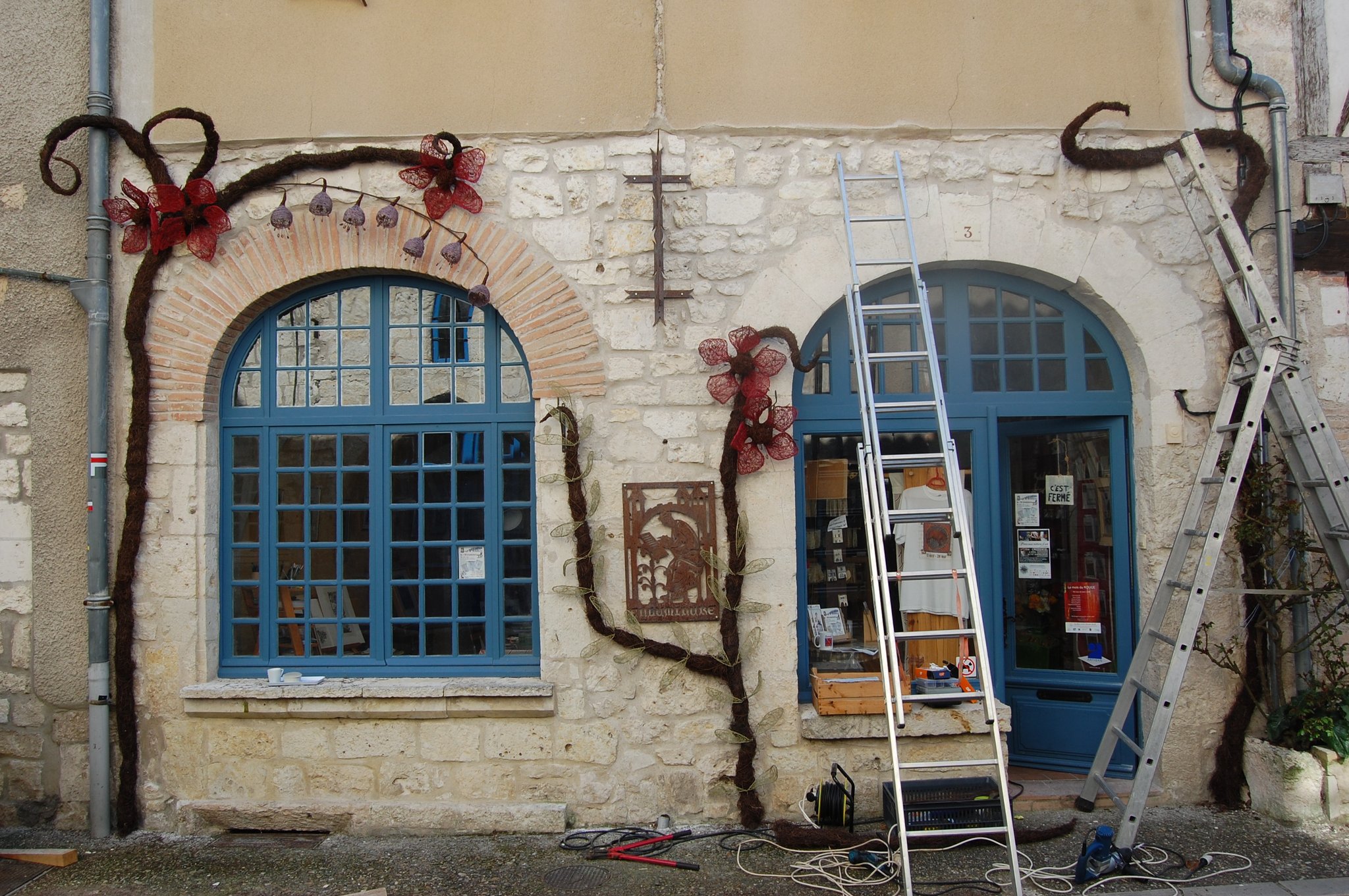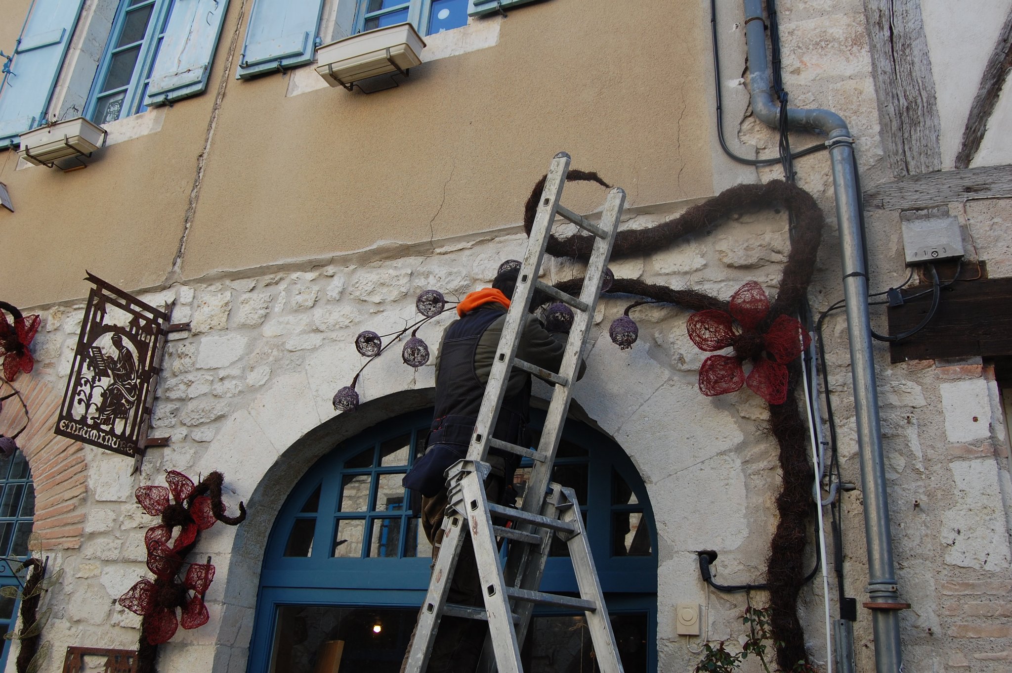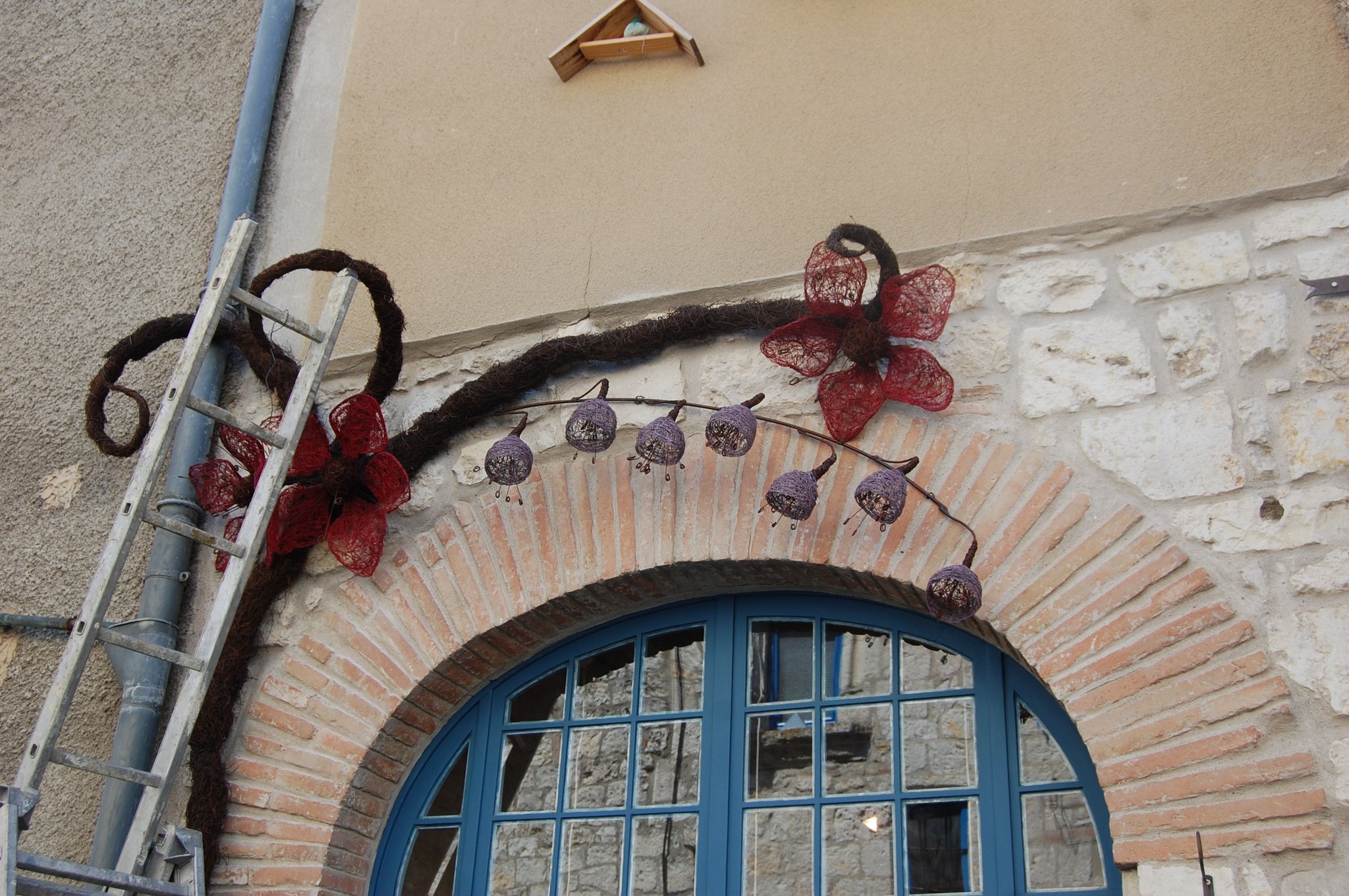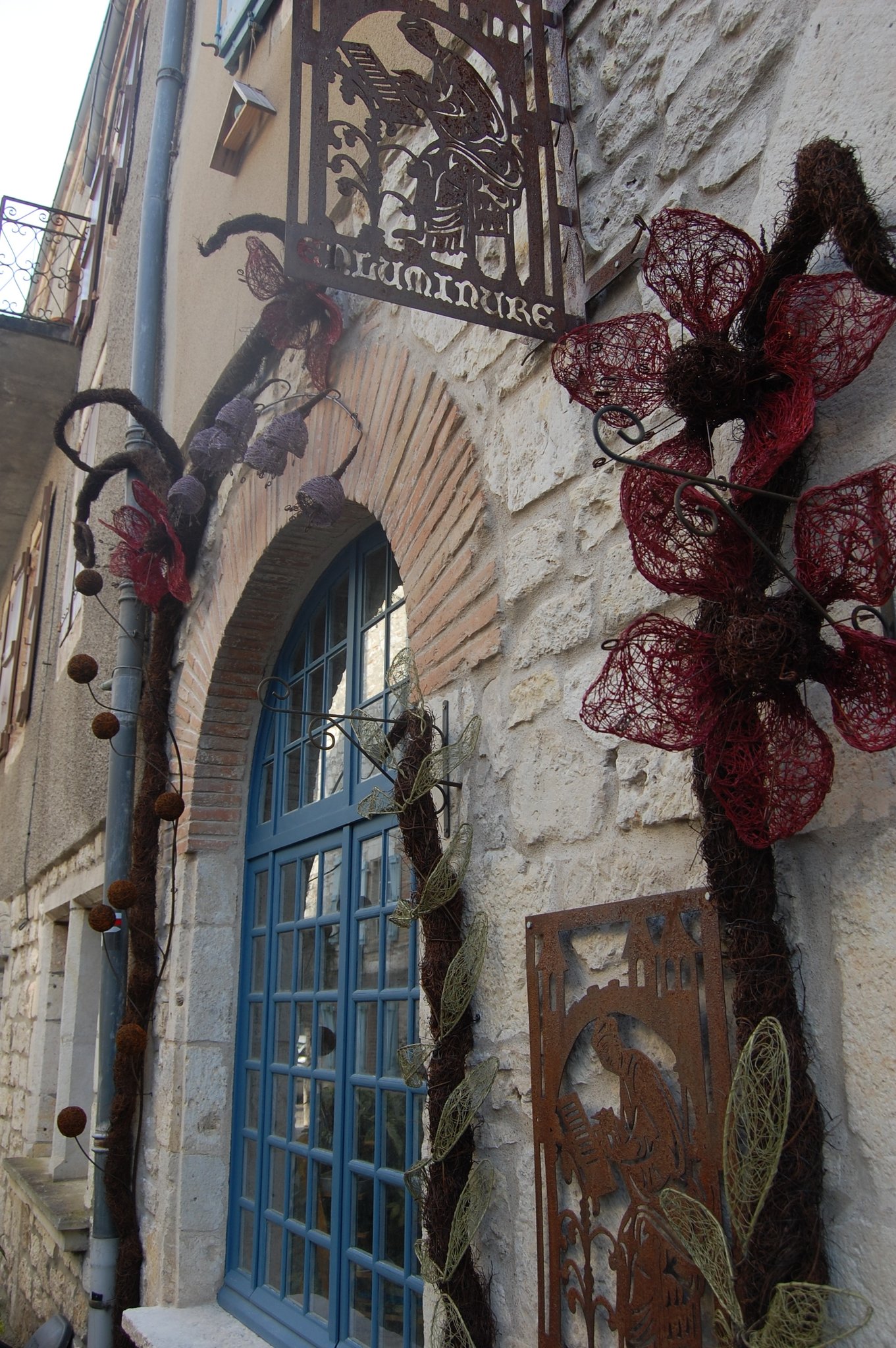 Pour enluminer notre façade nous avons fait appel au talent de Lya et Laurent Marino de l'entreprise Atmosfleur Créations située à St Antonin Nobleval dans le Tarn et Garonne.. C'est ainsi que tel mes enluminures, ils ont décoré le mur de fleurs, clochettes et feuillage en métal. Merci beaucoup à eux.