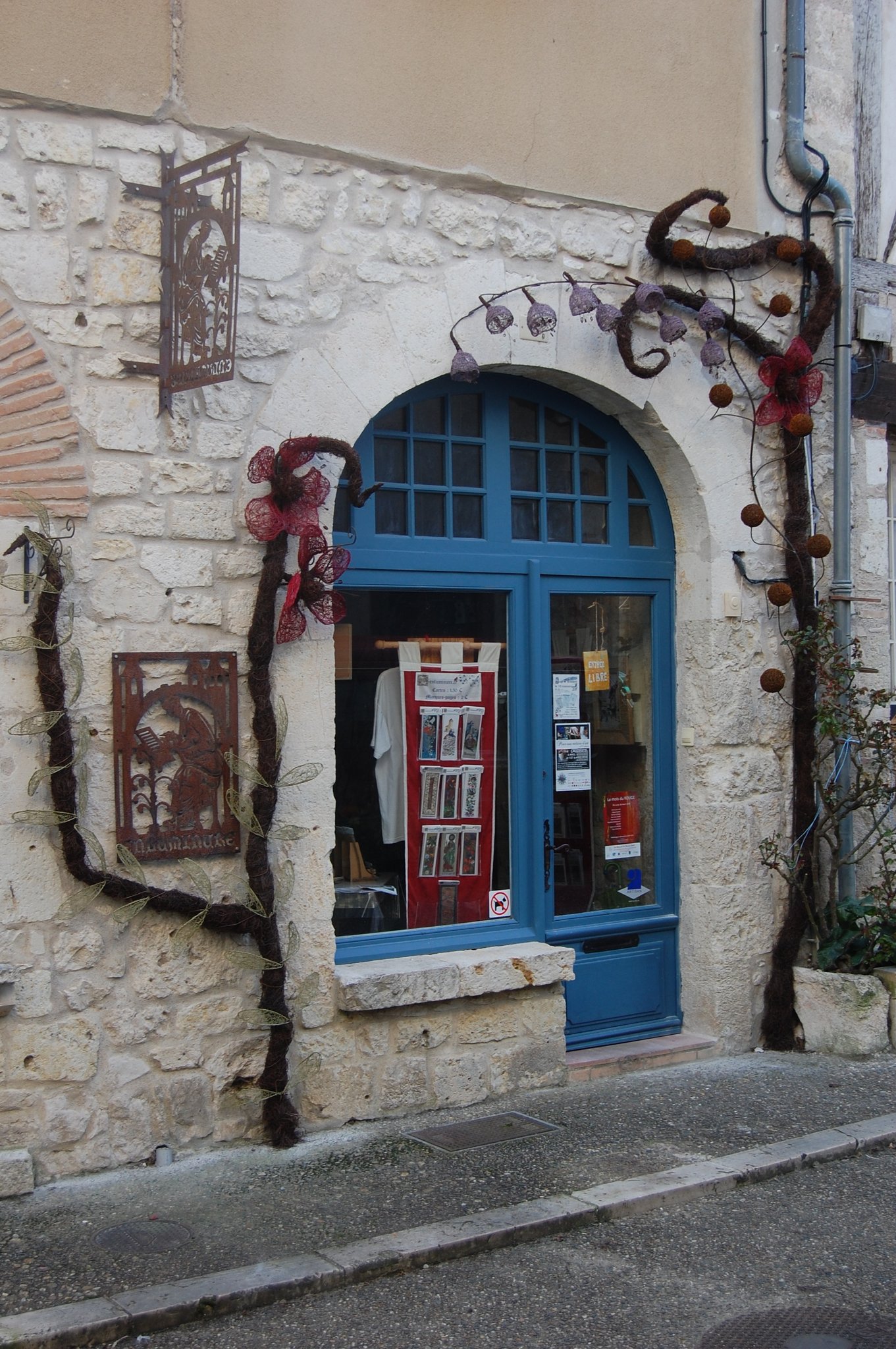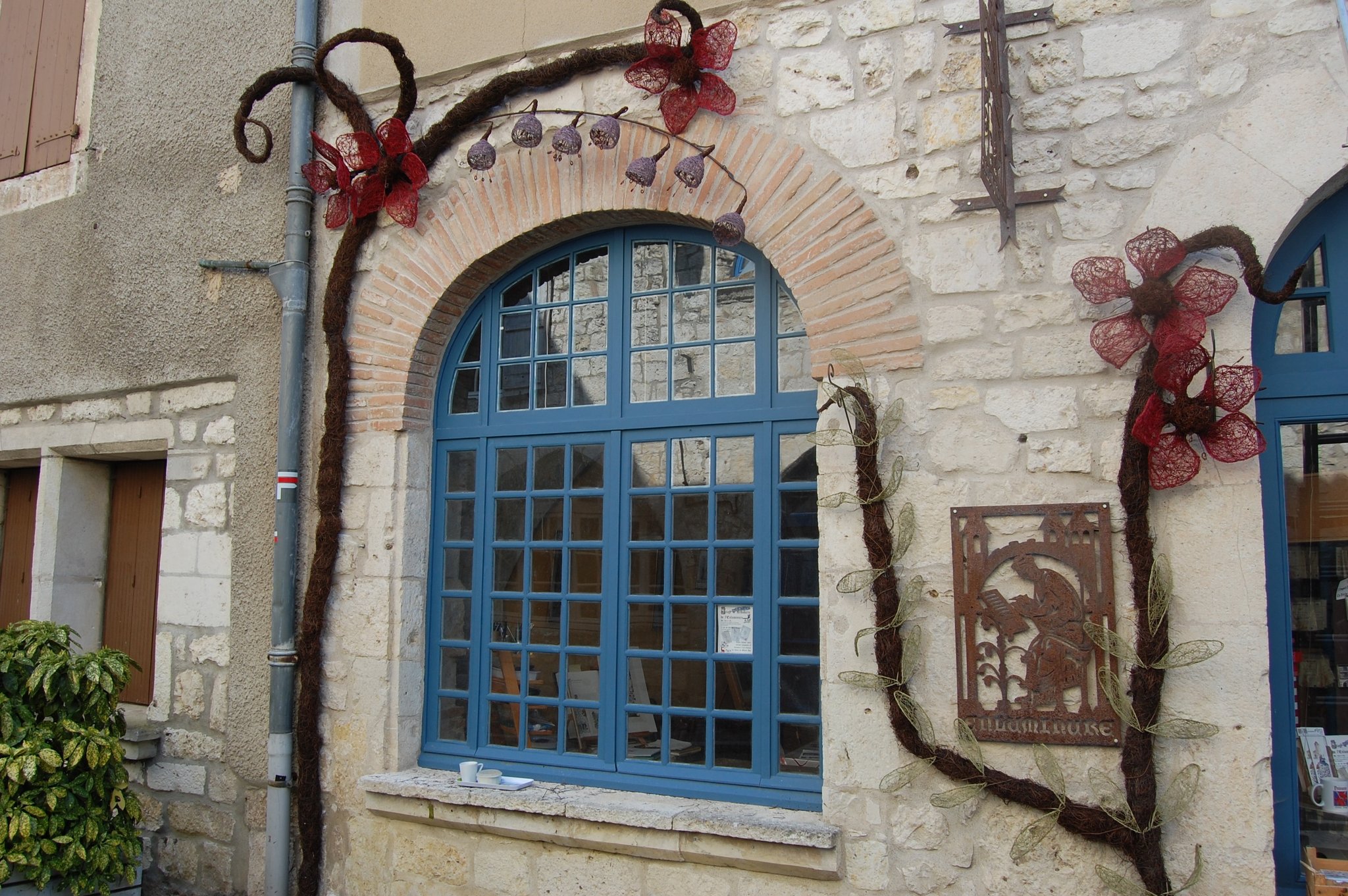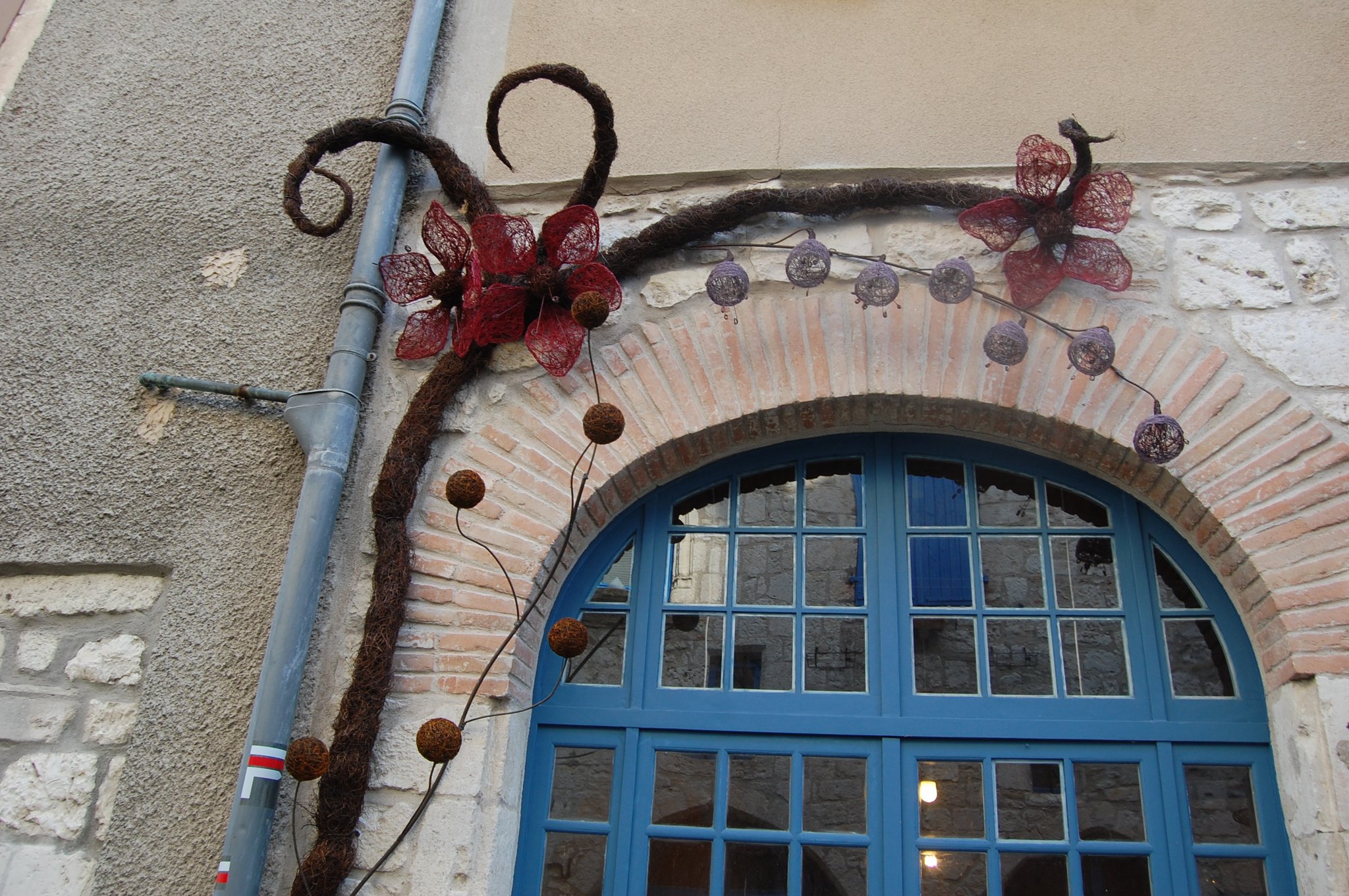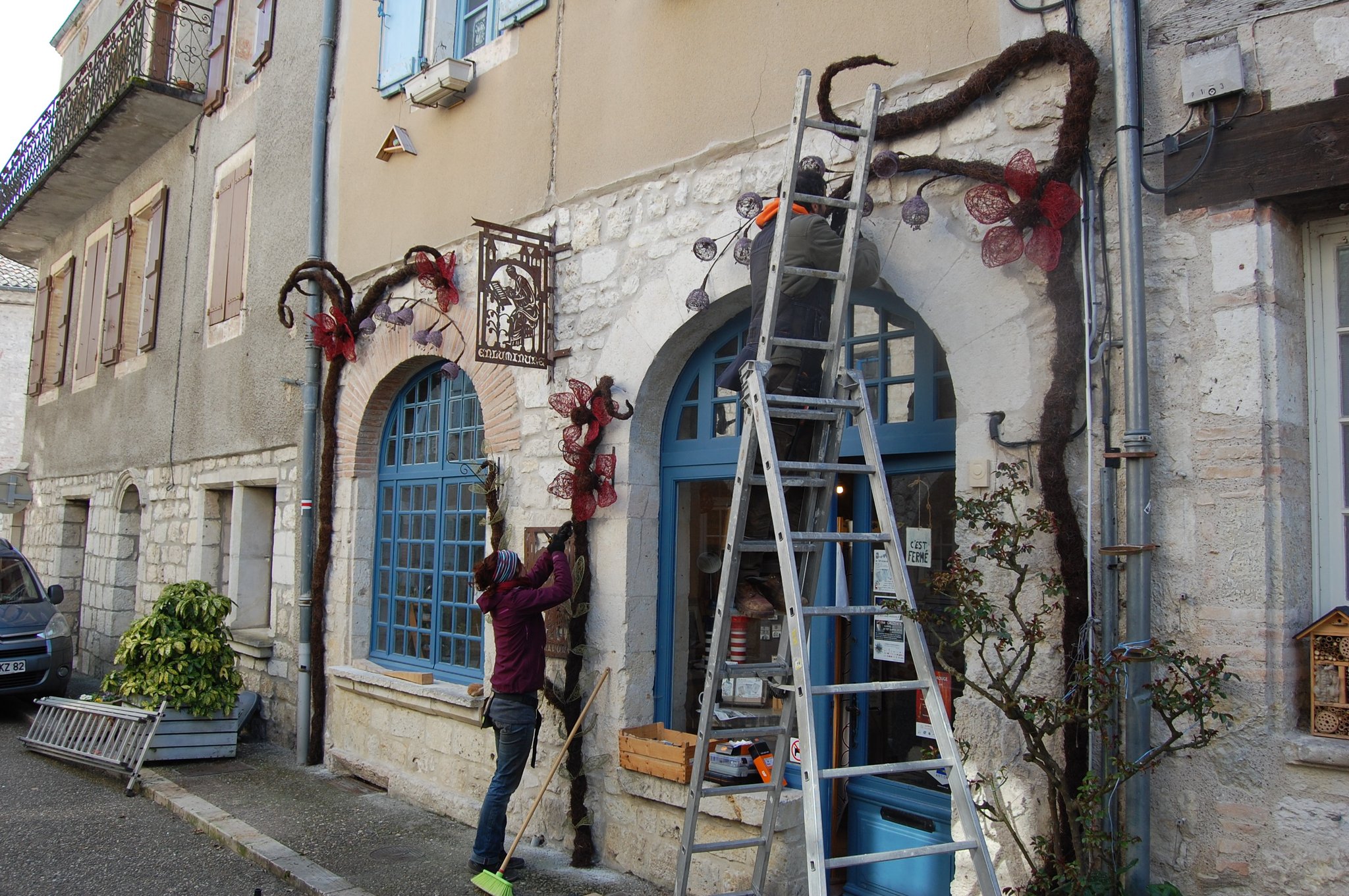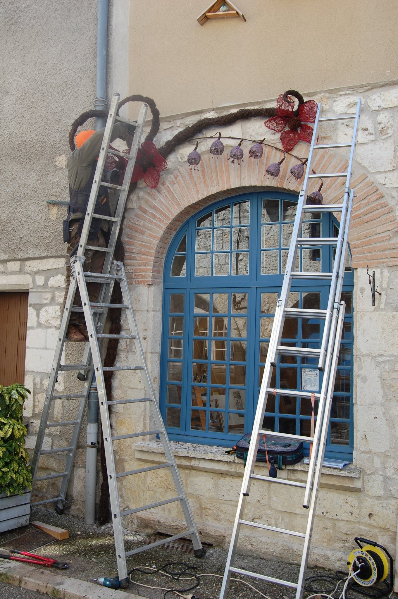 Pour enluminer notre façade nous avons fait appel au talent de Lya et Laurent Marino de l'entreprise Atmosfleur Créations située à St Antonin Nobleval dans le Tarn et Garonne.. C'est ainsi que tel mes enluminures, ils ont décoré le mur de fleurs, clochettes et feuillage en métal. Merci beaucoup à eux.