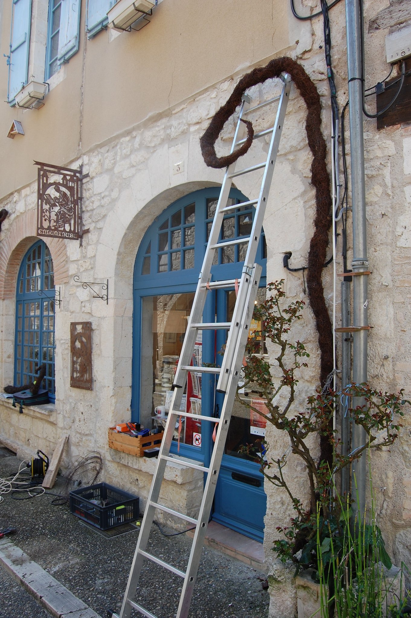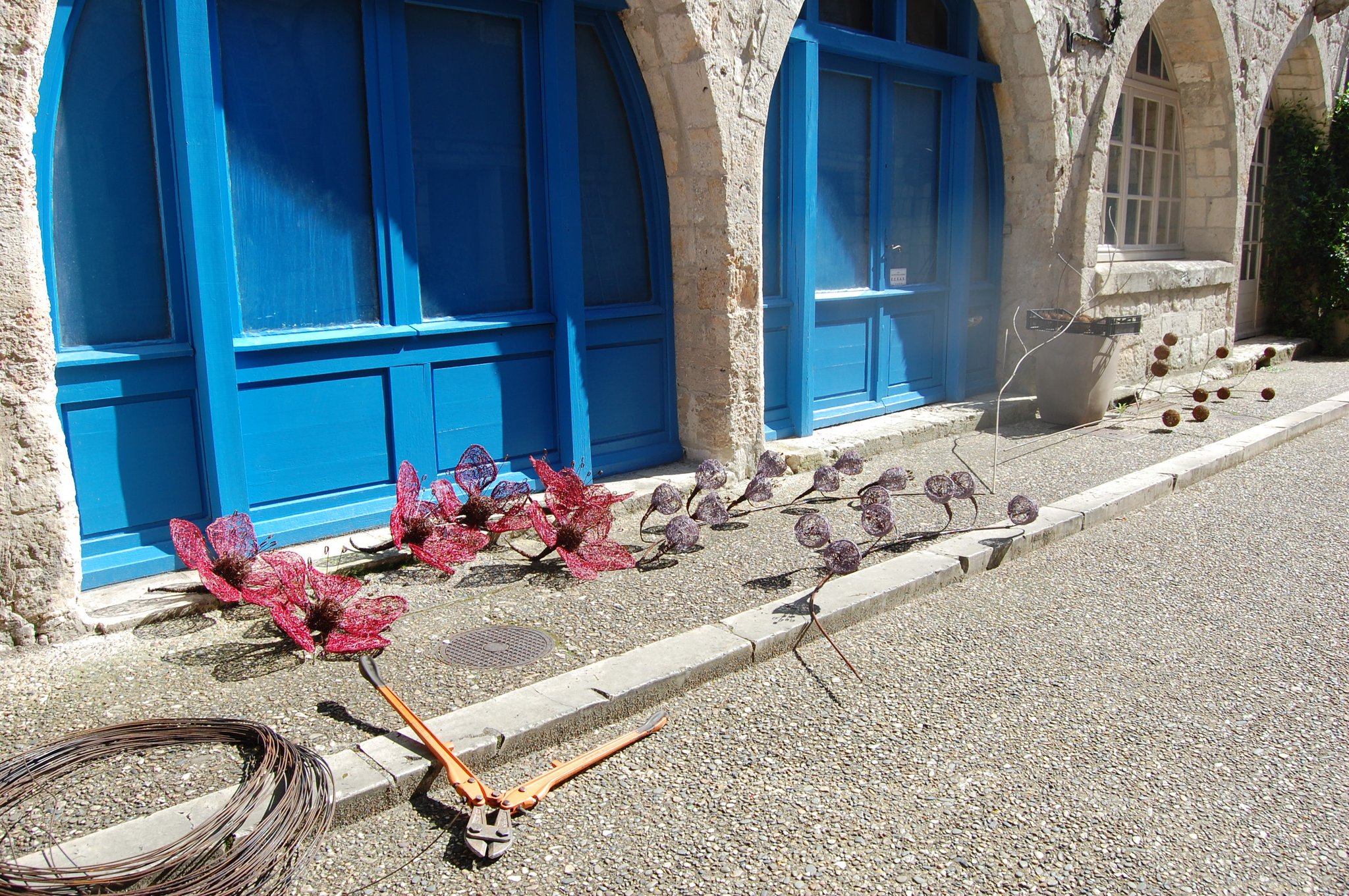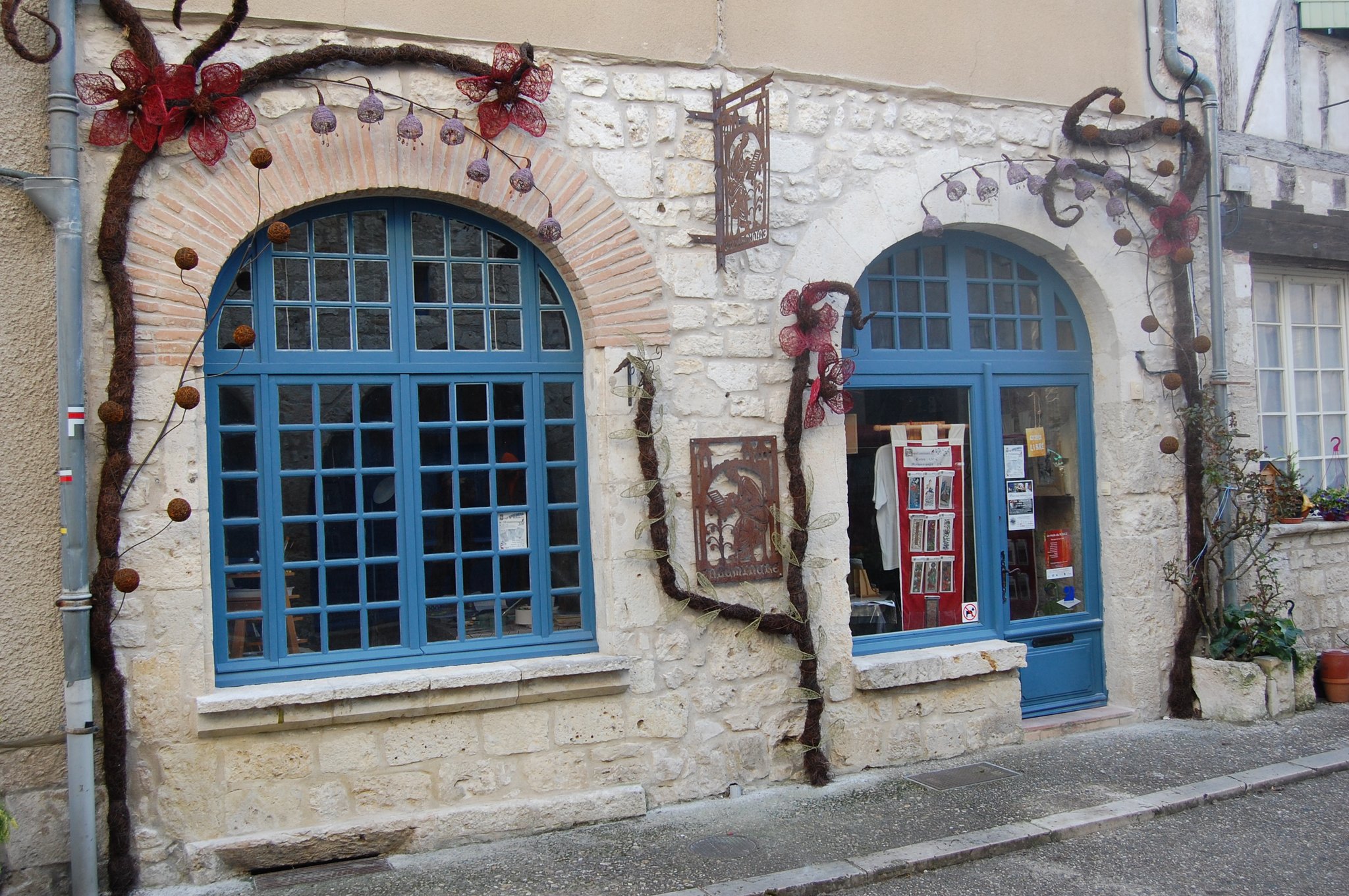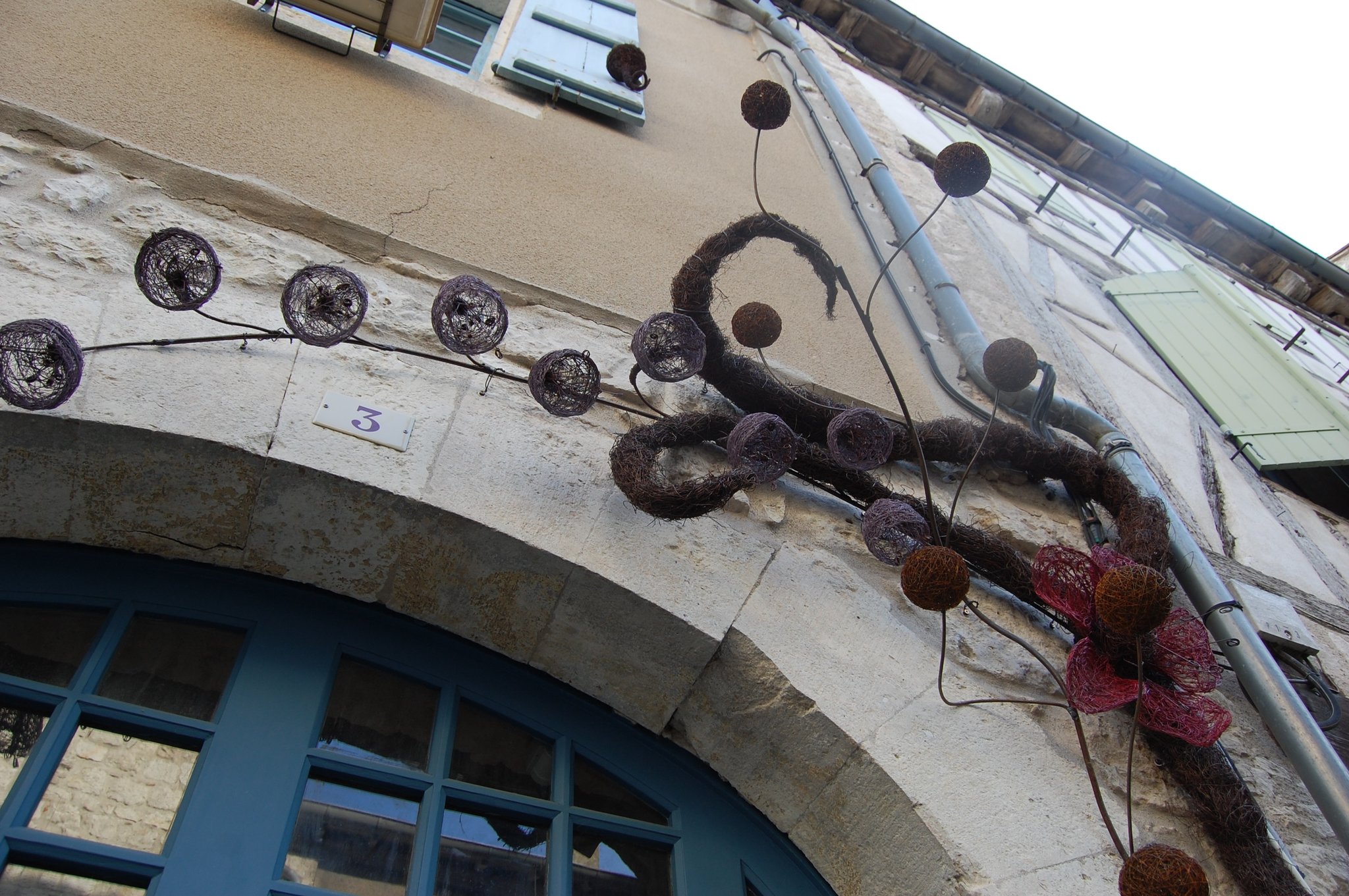 Pour enluminer notre façade nous avons fait appel au talent de Lya et Laurent Marino de l'entreprise Atmosfleur Créations située à St Antonin Nobleval dans le Tarn et Garonne.. C'est ainsi que tel mes enluminures, ils ont décoré le mur de fleurs, clochettes et feuillage en métal. Merci beaucoup à eux.